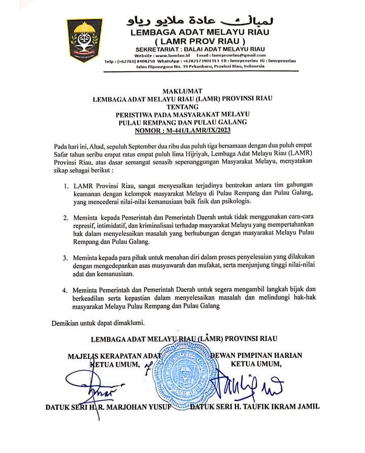 Bentuk keprihatinan itu, LAMR memberikan pernyataan senasib sepenanggungan masyarakat Melayu dalam bentuk maklumat dengan nomor: M-441/LAMR/IX/2023. Demikian disampaikan Sekretaris Umum (Sekum) MKA LAM Riau Alang Rizal, Ahad (10/9/23). Maklumat ini juga nantinya akan dikirimkan ke Presiden Joko Widodo (Jokowi).