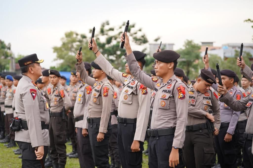 PEKANBARU-Kepolisian Daerah (Polda) Riau menggelar apel Satgas Operasi Mantap Brata Lancang Kuning 2023 tahapan II pengamanan kampanye, Selasa (28/11/2023) petang.