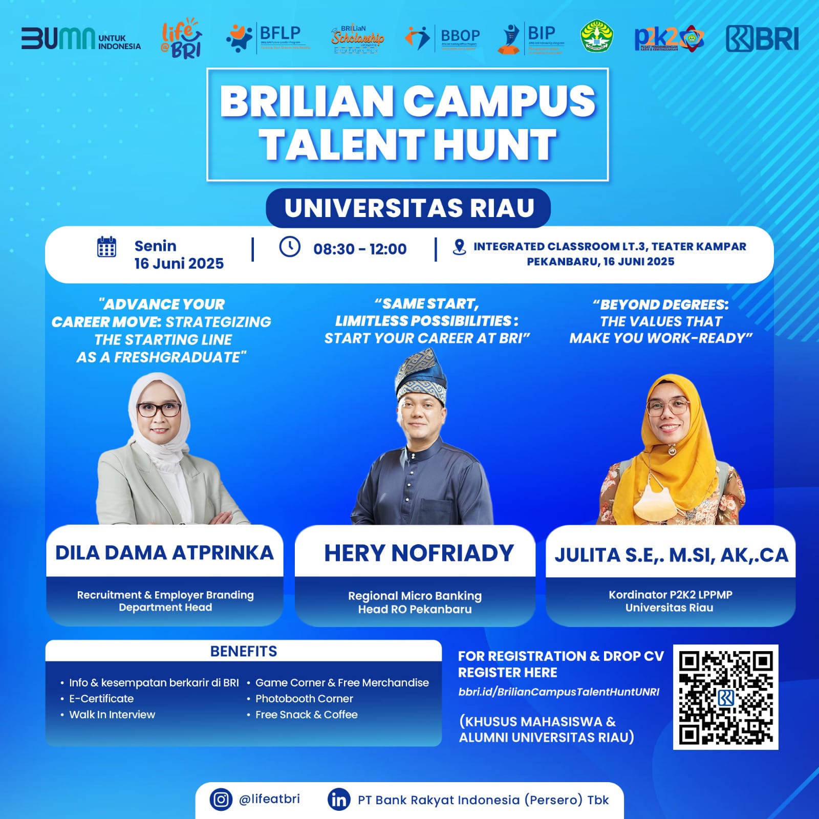 BHARABAS MEDIA -- PT Bank Rakyat Indonesia (BRI) (Persero) Tbk memberikan peluang kerja bagi mahasiswa dan alumni Universitas Riau (UNRI) dengan menyelenggarakan BRILian Campus Talent Hunt 2025.