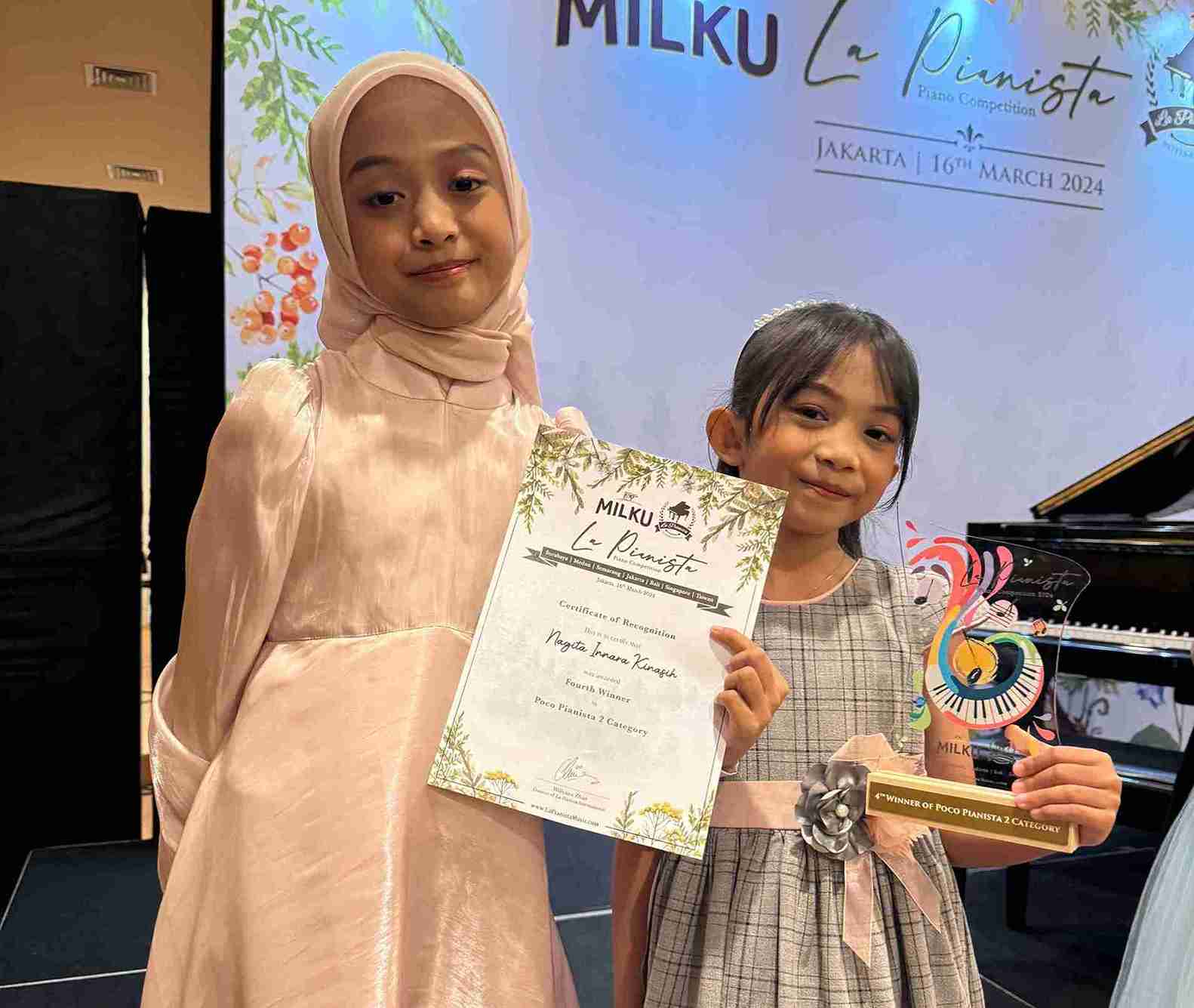 Rigina dan Nagita yang masih duduk di bangku Sekolah Dasar tersebut berhasil membawa 3 gelar antara lain 2nd Winner Buono Pianista 2 Category, 4th Poco Pianista 2 Category serta 2nd Winner pada Piano Duet Category. 3 Trophy diboyong sekaligus pada kompetisi piano yang diikuti ratusan peserta dari seluruh Indonesia ini.